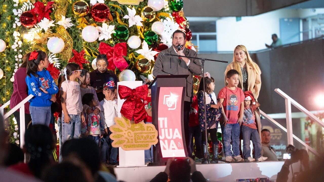 Tijuana, Baja California, a 10 de diciembre de 2025. El Ayuntamiento de Tijuana llevó a cabo el encendido del árbol navideño 2025 instalado en el patio central de Palacio Municipal, un espacio que permanecerá abierto al personal y a la ciudadanía que acuda a realizar trámites durante la temporada decembrina.