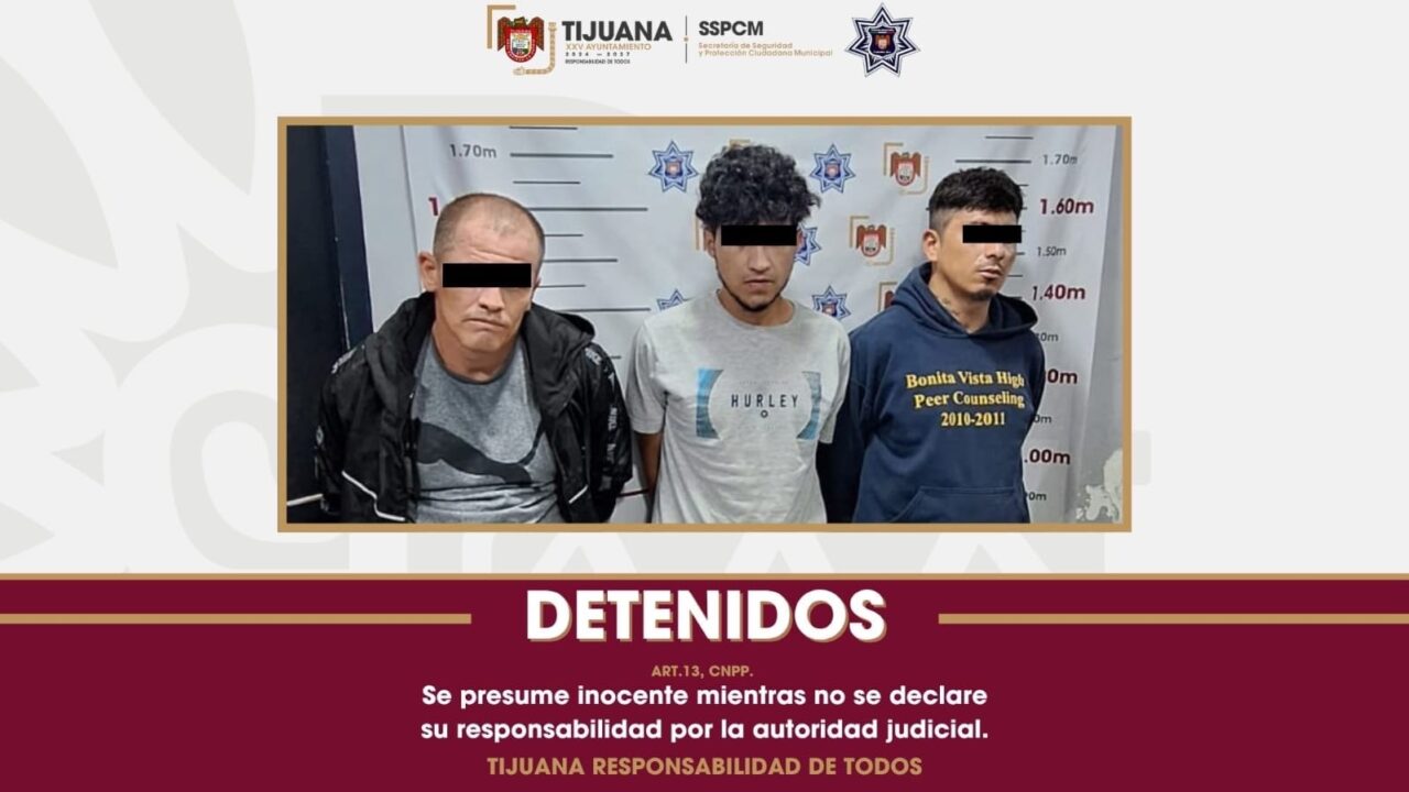 Tijuana, Baja California, 27 de julio de 2025. Tres hombres fueron detenidos por agentes de la Policía Municipal luego de ser identificados como los presuntos responsables de un asalto con violencia a casa habitación, registrado en una zona residencial de esta ciudad.