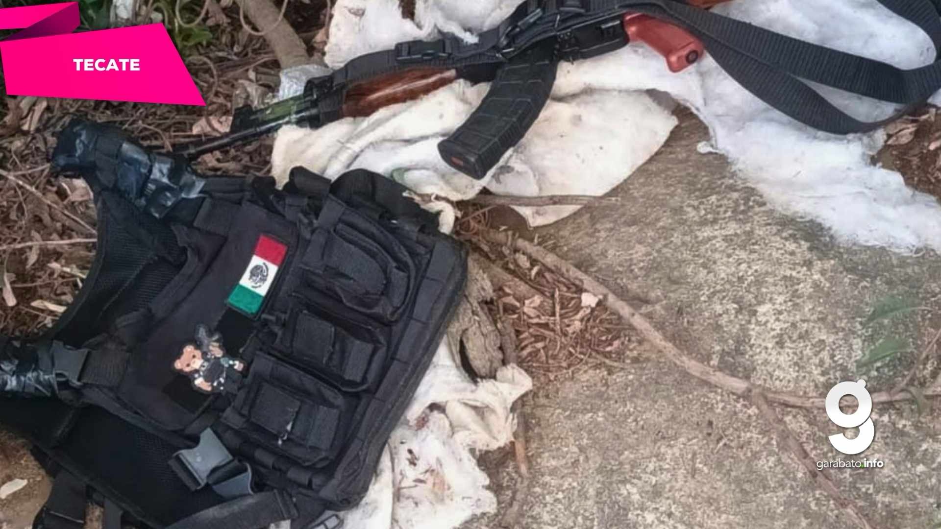 Durante la revisión del área, los oficiales localizaron entre la maleza un rifle color negro con culata café, el cual contaba con un cargador abastecido. En el mismo punto también fue encontrado un chaleco táctico color negro.