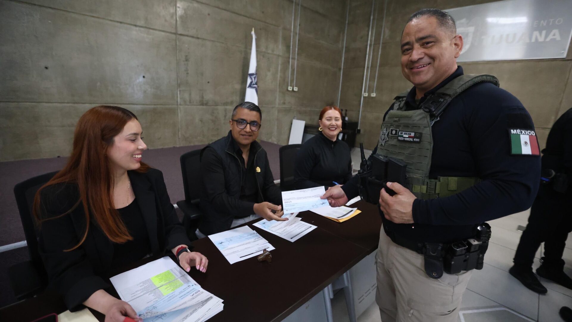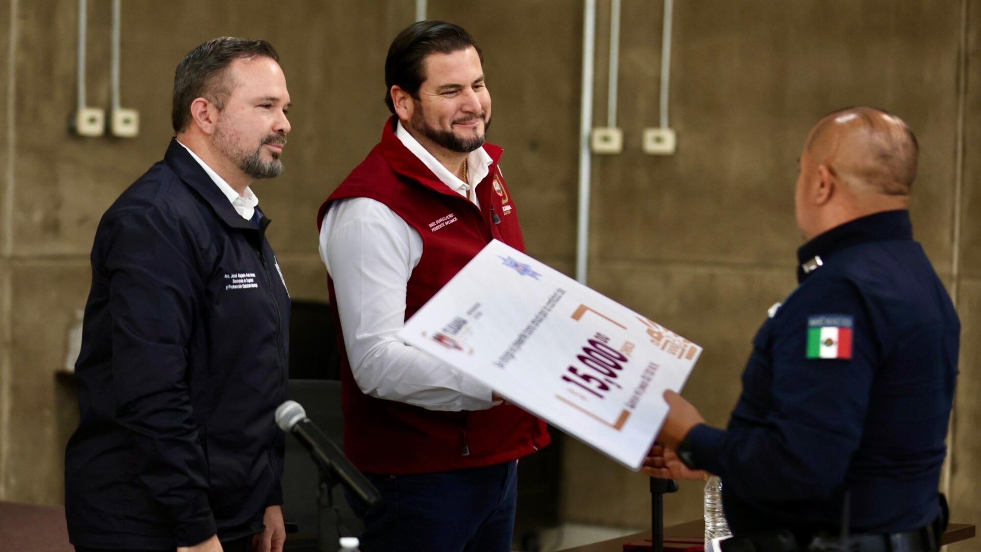 Como parte del protocolo, el presidente municipal y el secretario realizaron la entrega simbólica de un cheque al director general de la Policía Municipal, David García Barraza, quien recibió el documento en representación de los mil 823 elementos beneficiados.