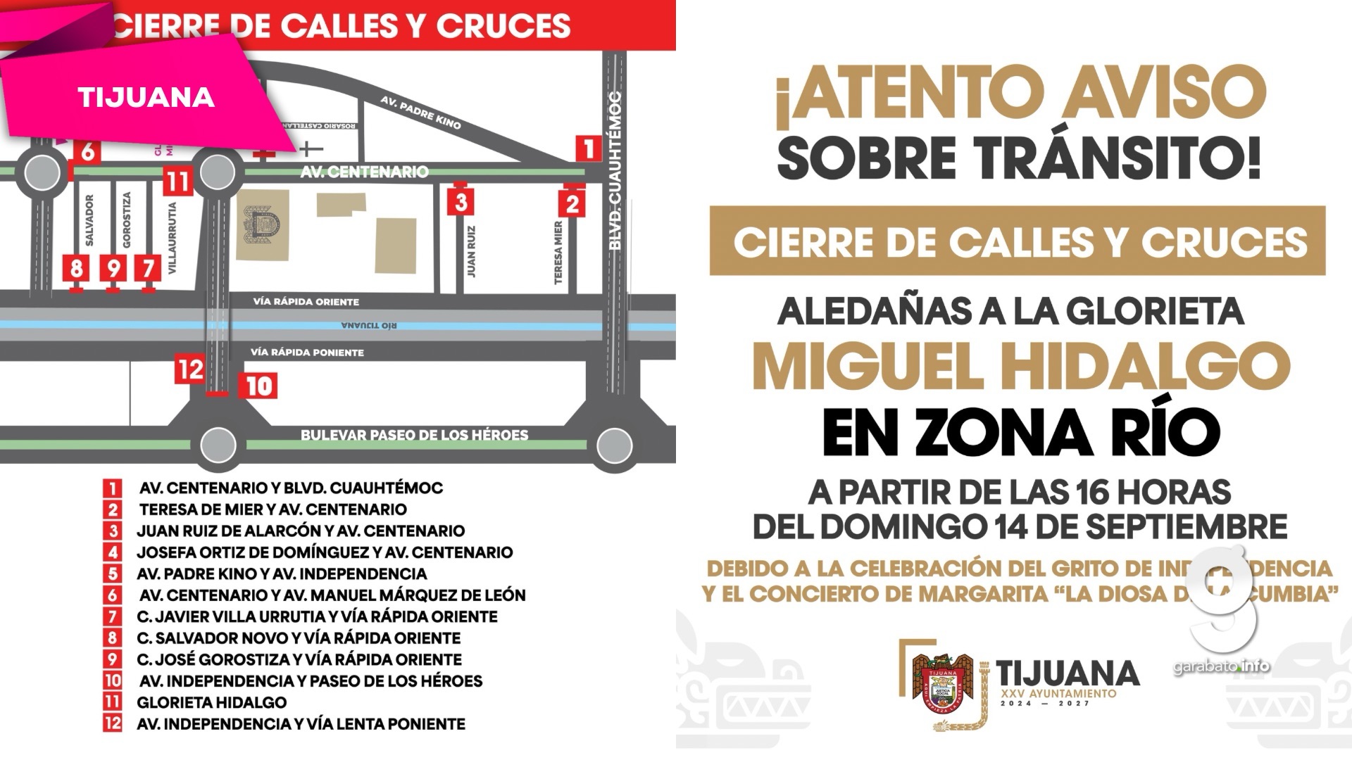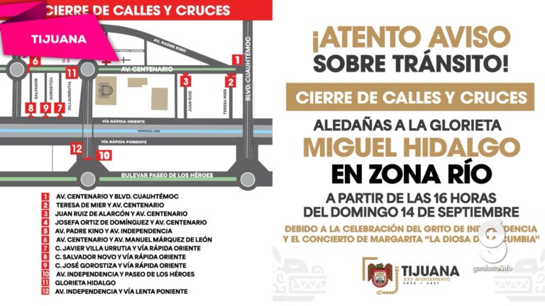 Tijuana, Baja California, a 13 de septiembre de 2025. Las autoridades municipales confirmaron que a partir de las 16:00 horas del domingo 14 de septiembre comenzará un operativo especial de tránsito con motivo de las Fiestas Patrias. El despliegue contempla cierres viales en el primer cuadro de la ciudad, donde se realizará el tradicional Grito de Independencia y el concierto de Margarita “La Diosa de la Cumbia”.