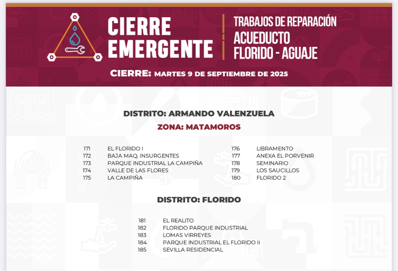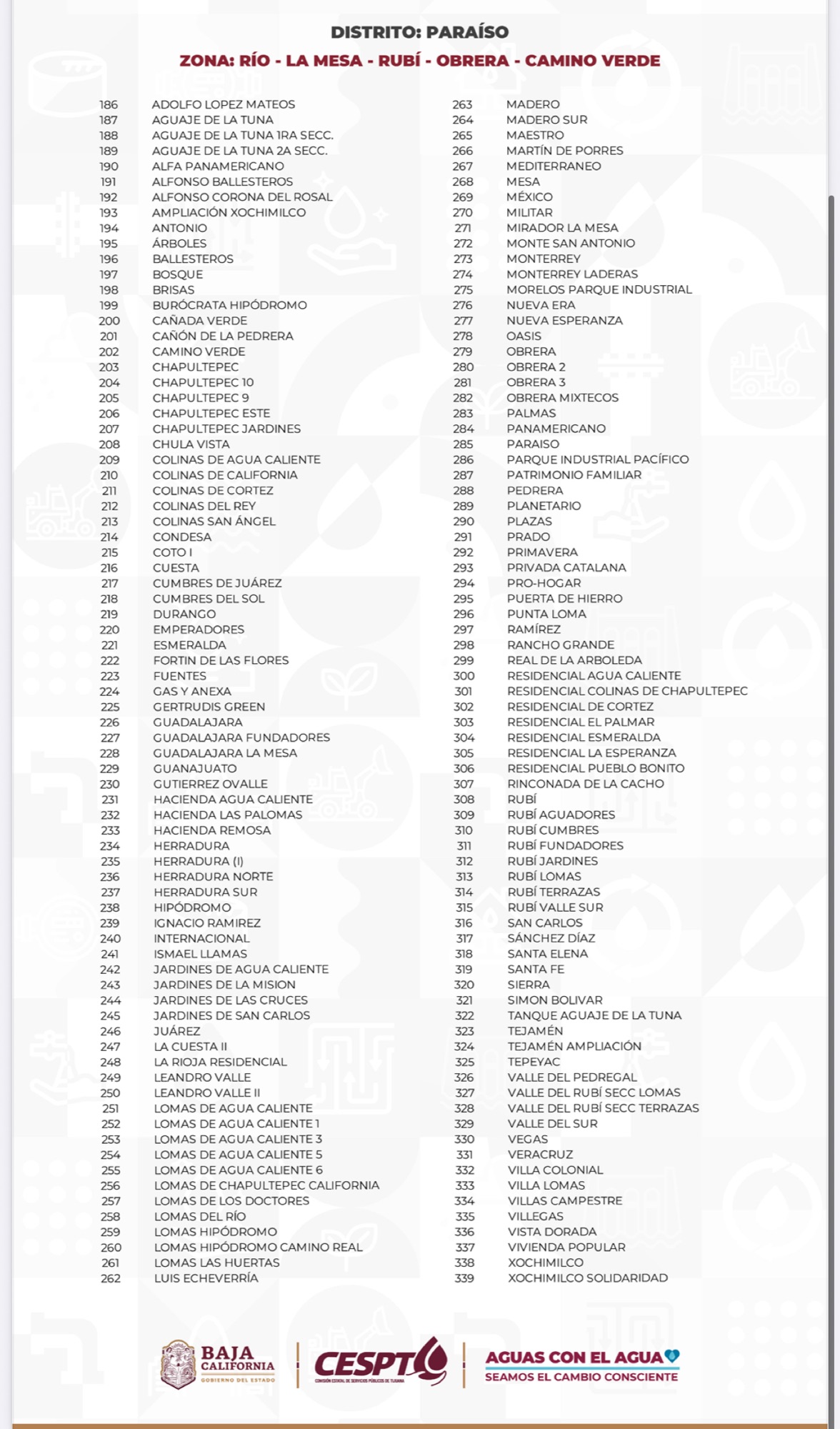 El desperfecto obligó a realizar un cierre emergente que afecta el suministro en más de 632 colonias. Entre las zonas más reconocidas están Playas de Tijuana, Camino Verde, Sánchez Taboada, La Gloria, El Florido, Lomas del Pacífico, Independencia, Villas del Prado y distintos fraccionamientos en Playas de Rosarito como Quintas del Mar, Constitución y Lucio Blanco.