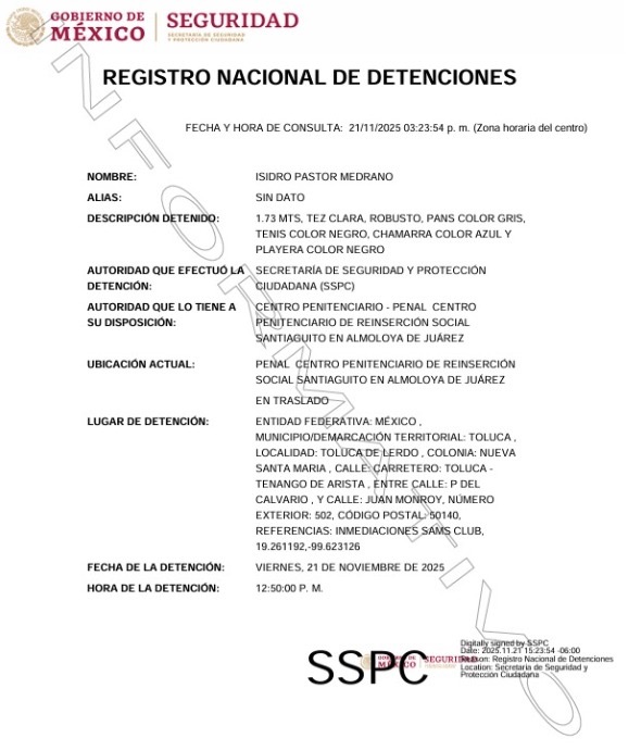 Toluca, Estado de México, 21 de noviembre de 2025.- Autoridades federales confirmaron la detención del exdirigente del Partido Revolucionario Institucional (PRI) en el Estado de México, Isidro Pastor Medrano, quien fue asegurado este viernes y trasladado al Centro Penitenciario y de Reinserción Social de Almoloya de Juárez, de acuerdo con el Registro Nacional de Detenciones de la Secretaría de Seguridad y Protección Ciudadana.