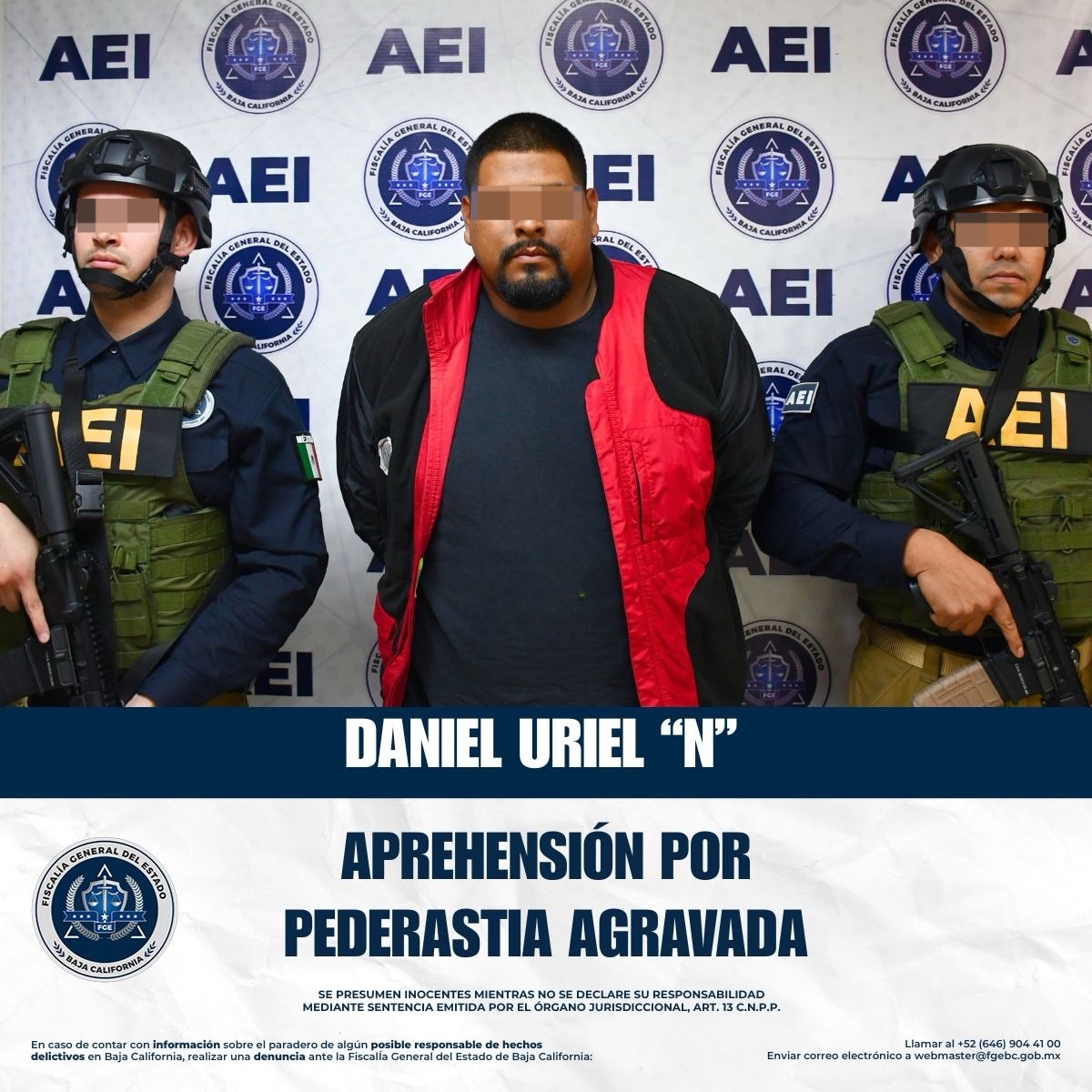 Tijuana, Baja California, 10 de enero de 2026.- Elementos de la Fiscalía General del Estado ejecutaron una orden de aprehensión contra un hombre identificado como Daniel Uriel “N”, señalado por su probable responsabilidad en el delito de pederastia agravada, como parte de una acción judicial orientada a la protección de los derechos de niñas, niños y adolescentes.