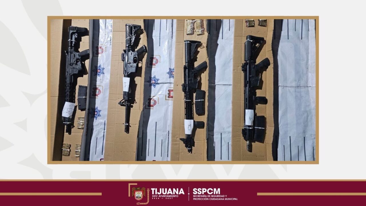 Tijuana, Baja California, 18 de noviembre de 2025. Elementos de la Secretaría de Seguridad y Protección Ciudadana Municipal (SSPCM) detuvieron a dos personas y aseguraron cuatro armas largas, tras ubicar un vehículo que coincidía con un reporte de sujetos armados en la colonia Real de los Valles.