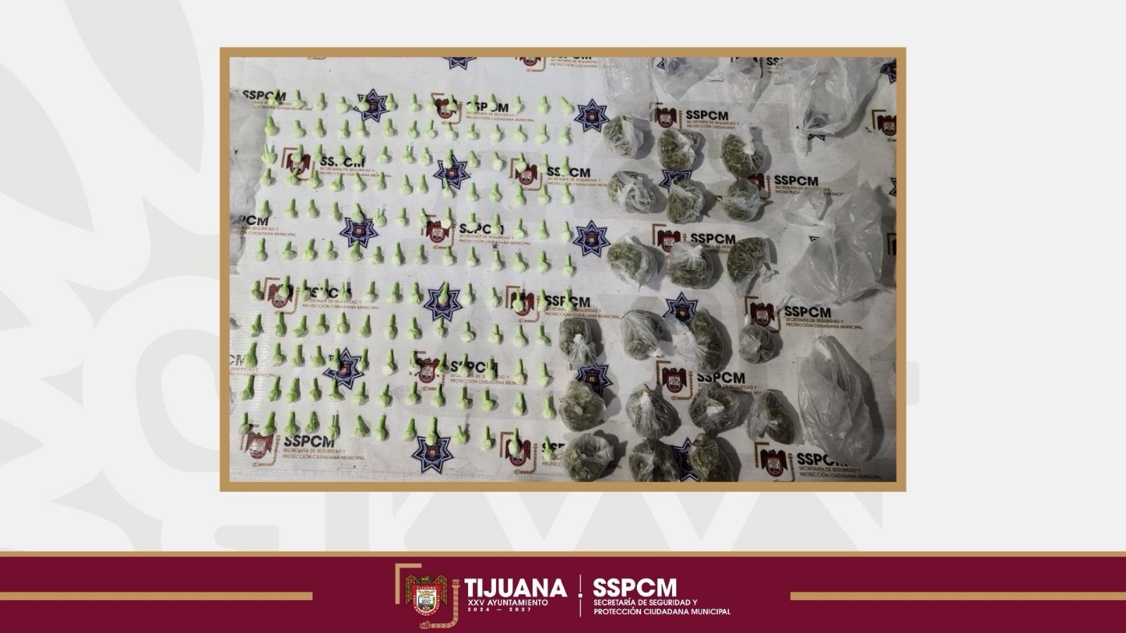 En una revisión visual al interior del taxi, los agentes localizaron un paquete de plástico transparente en el área del portavasos que contenía 150 envoltorios con una sustancia granulada, con características similares a la conocida como cristal. Además, se aseguraron 20 bolsas de plástico con hierba verde y seca, presuntamente marihuana.