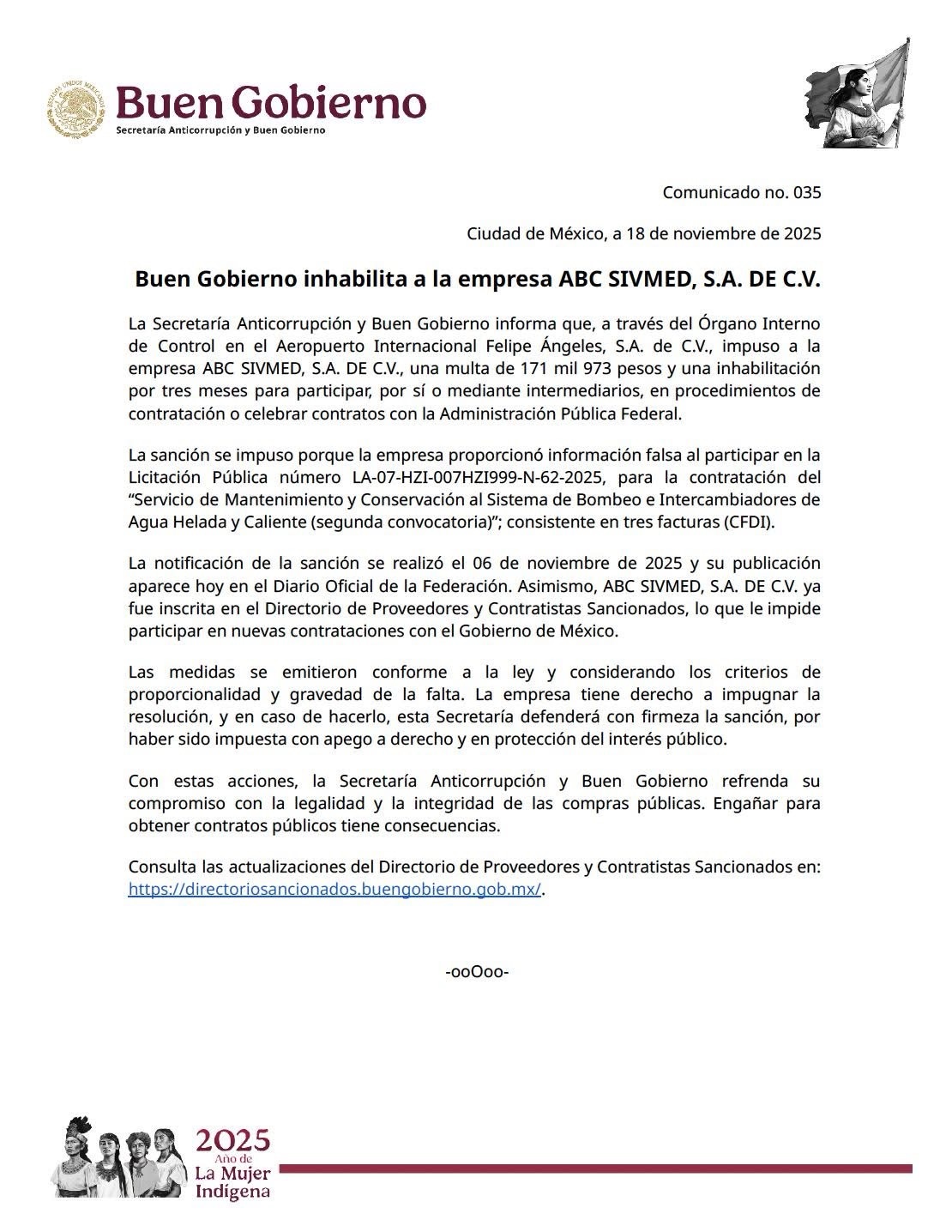 Ciudad de México, 18 de noviembre de 2025.- La Secretaría Anticorrupción y Buen Gobierno informó que la empresa ABC SIVMED, S.A. de C.V. fue inhabilitada por tres meses e incluida en el Directorio de Proveedores y Contratistas Sancionados del Gobierno de México, luego de detectarse el uso de documentación falsa en una licitación pública relacionada con servicios de mantenimiento en el Aeropuerto Internacional Felipe Ángeles (AIFA).