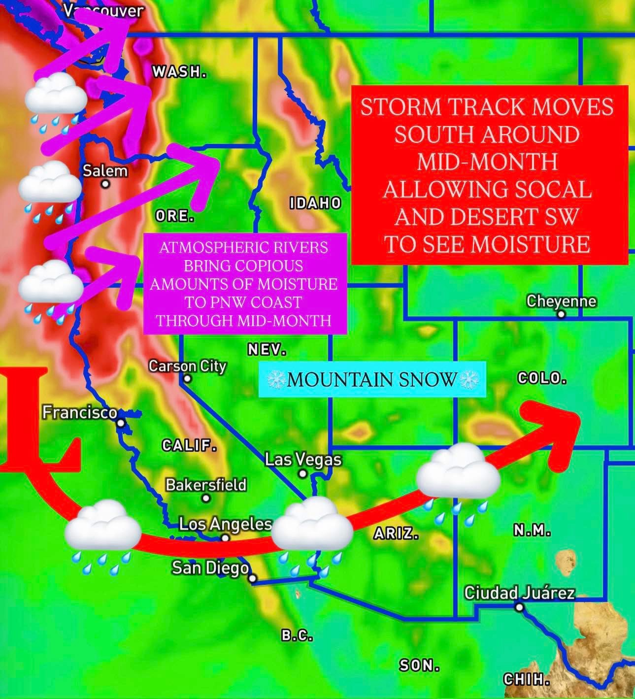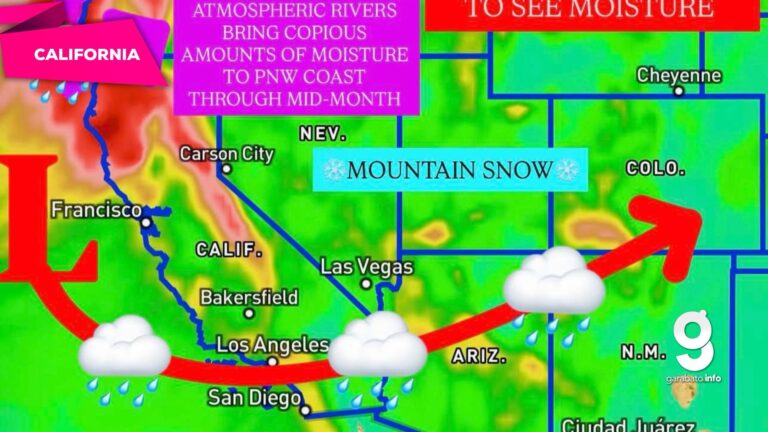 De acuerdo con el pronóstico, hacia mediados de mes se espera un cambio en el patrón atmosférico que permitirá el desplazamiento de sistemas de tormenta hacia el sur, llevando humedad al sur de California y al desierto del suroeste, incluyendo partes de Arizona, Nevada y Nuevo México.