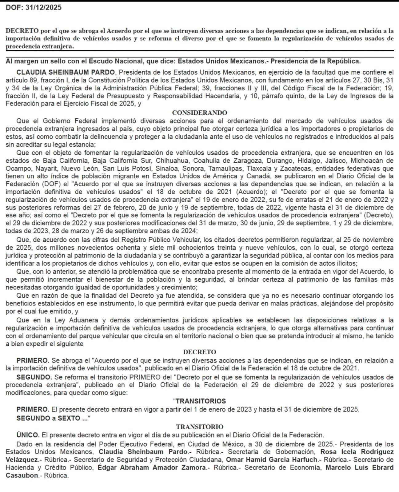 Tijuana, 1 de enero de 2026. — El Gobierno de México dio por cerrado el programa que permitió regularizar de forma extraordinaria vehículos usados de procedencia extranjera. La conclusión quedó marcada por un decreto publicado el 31 de diciembre de 2025 en el Diario Oficial de la Federación (DOF), el cual abroga los acuerdos que otorgaban facilidades administrativas para incorporar unidades irregulares al padrón vehicular nacional desde 2022.