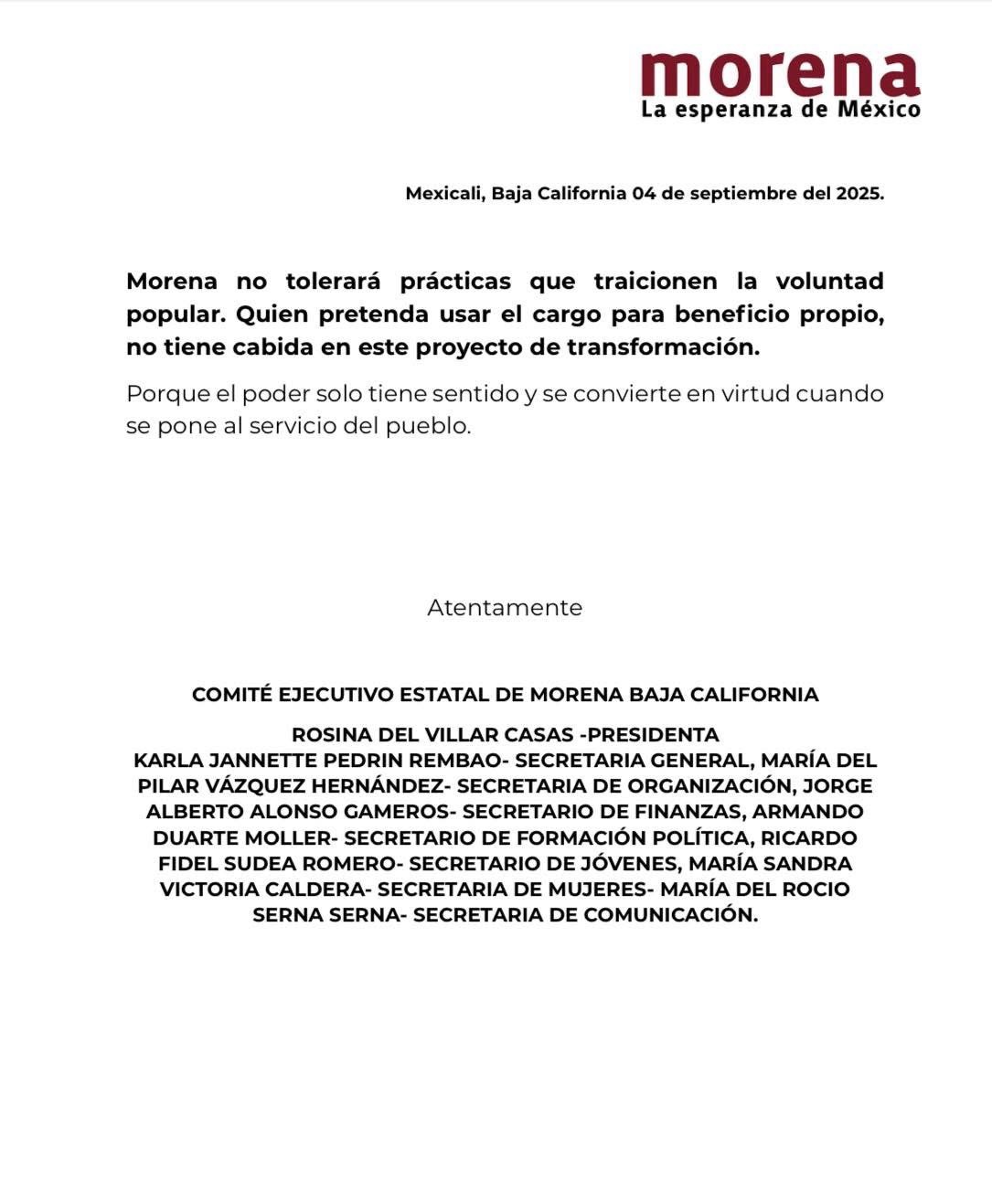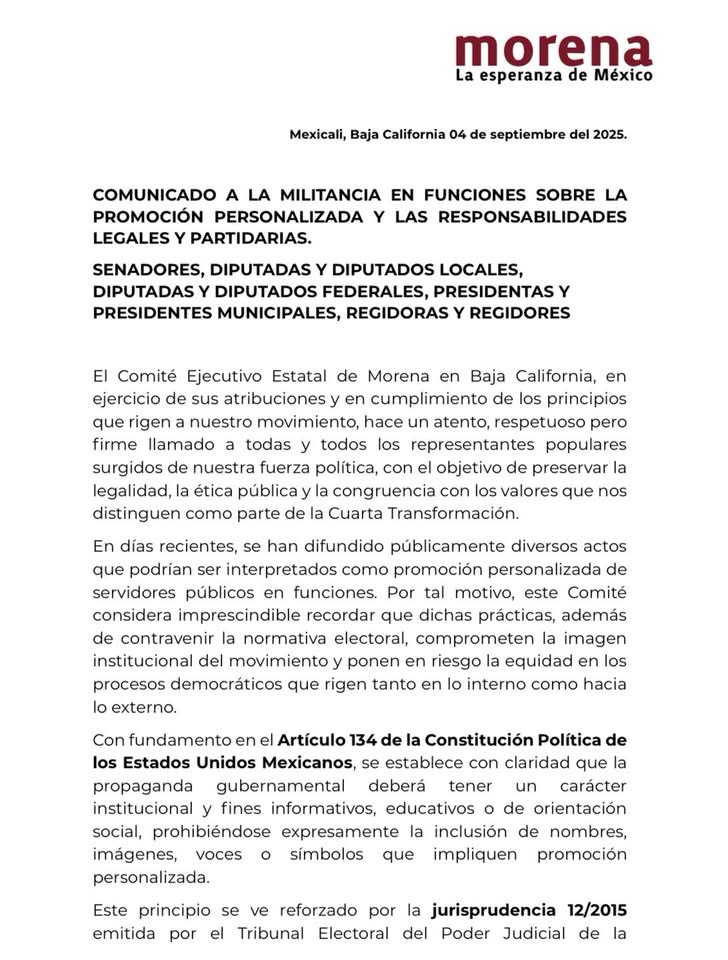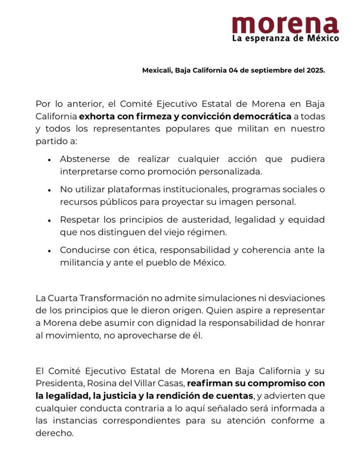 Mexicali, Baja California, 4 de septiembre de 2025.- El Comité Ejecutivo Estatal de Morena en Baja California lanzó un mensaje firme a senadores, diputados, presidentes municipales y regidores que forman parte del movimiento, advirtiendo sobre las consecuencias de incurrir en prácticas de autopromoción utilizando recursos públicos.