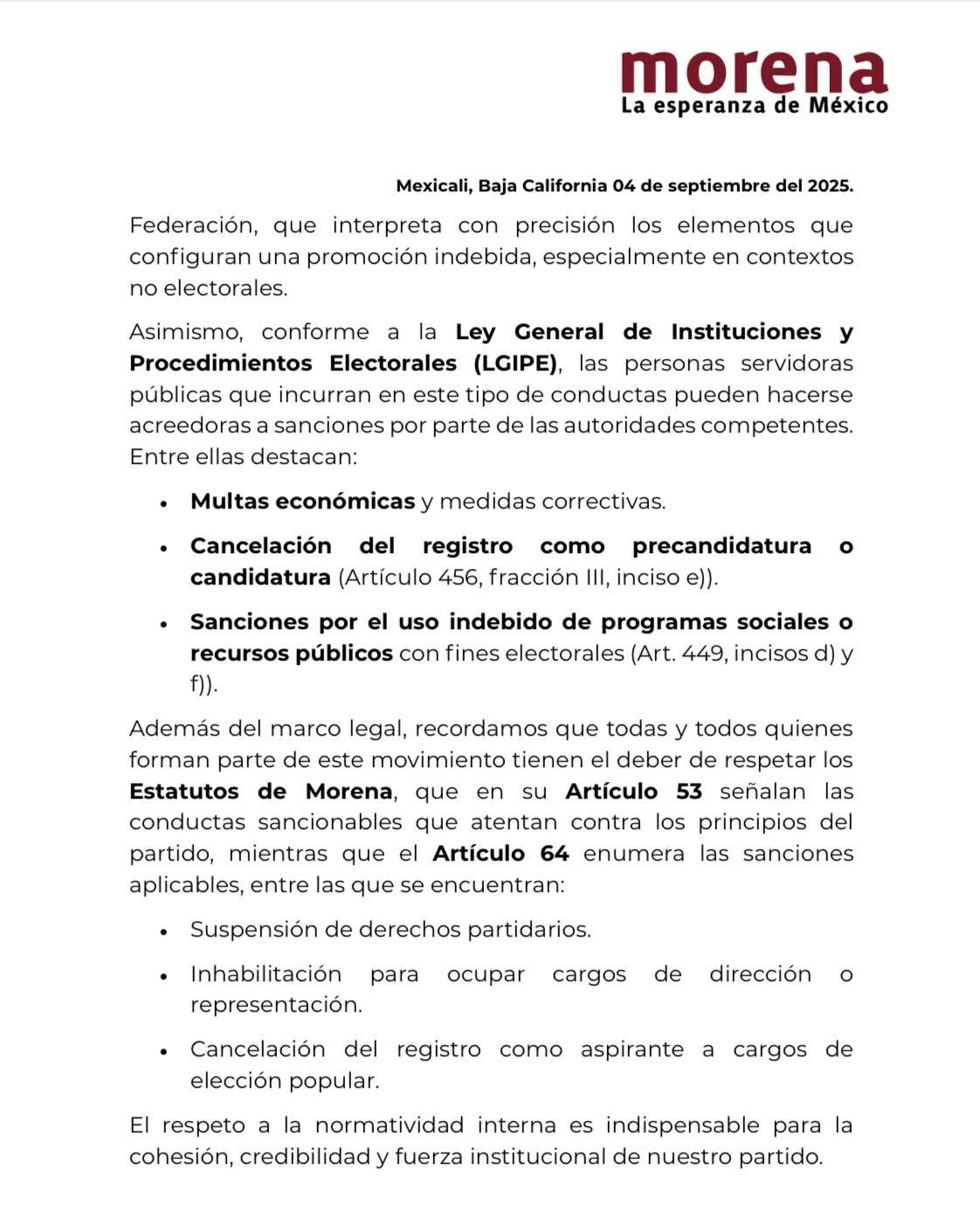 En el ámbito interno, el Comité recordó que los Estatutos de Morena son claros en prohibir conductas que atenten contra los principios del movimiento. El Artículo 53 enumera las prácticas sancionables, mientras que el Artículo 64 establece medidas como: