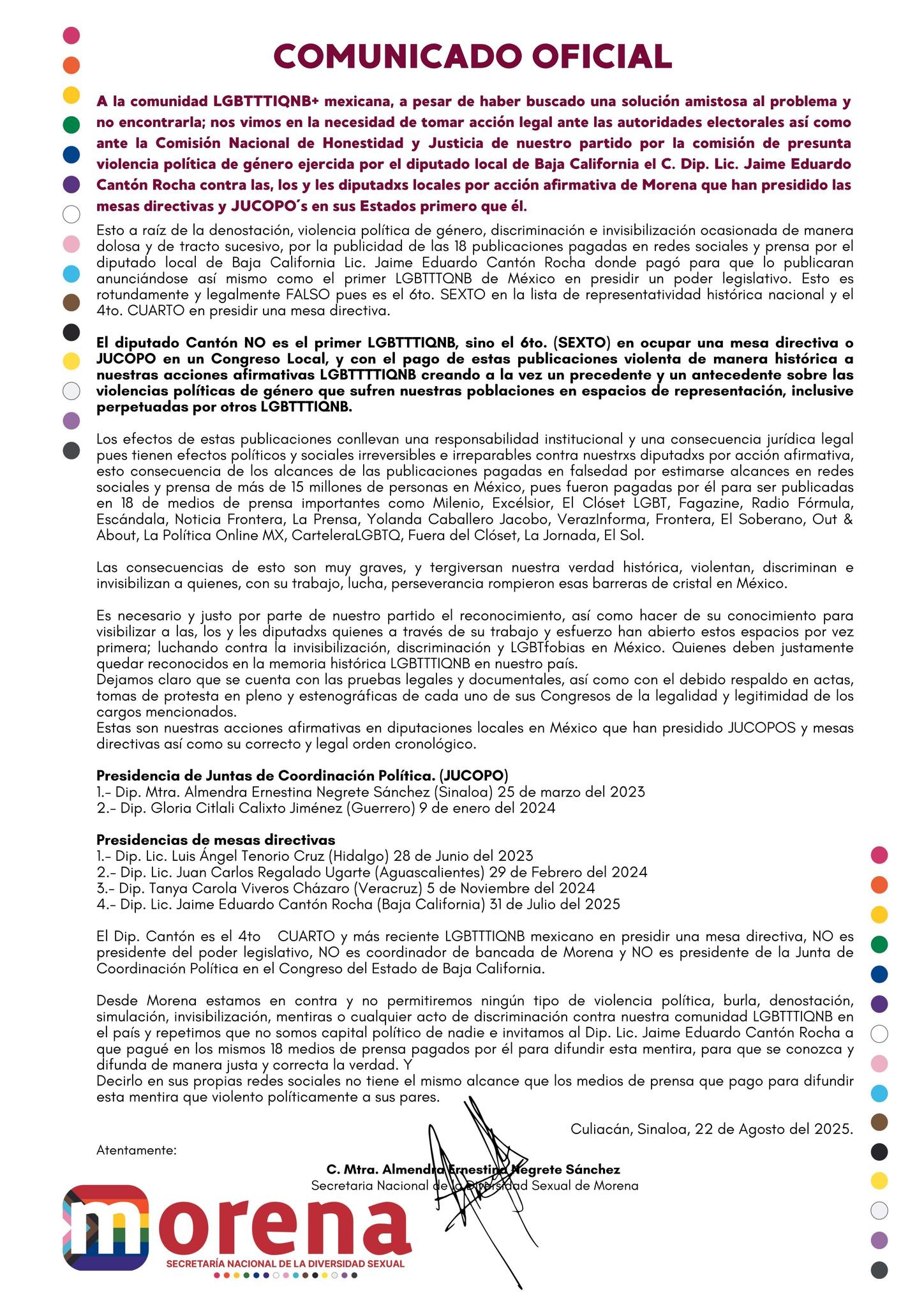 Culiacán, Sinaloa, 22 de agosto de 2025.- La Secretaría Nacional de la Diversidad Sexual de Morena emitió un comunicado oficial en el que rechazó las publicaciones pagadas en distintos medios que acreditaban al diputado de Baja California, Jaime Eduardo Cantón Rocha, como el primer legislador LGBTTTIQNB en presidir un poder legislativo en México.