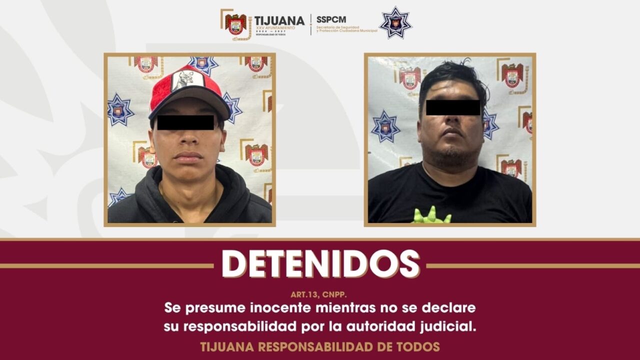 Tijuana, Baja California, a 23 de septiembre de 2025.- Agentes de la Policía Municipal lograron la detención de dos hombres presuntamente relacionados con al menos 26 robos con violencia cometidos en diversas sucursales de tiendas Oxxo en Tijuana.