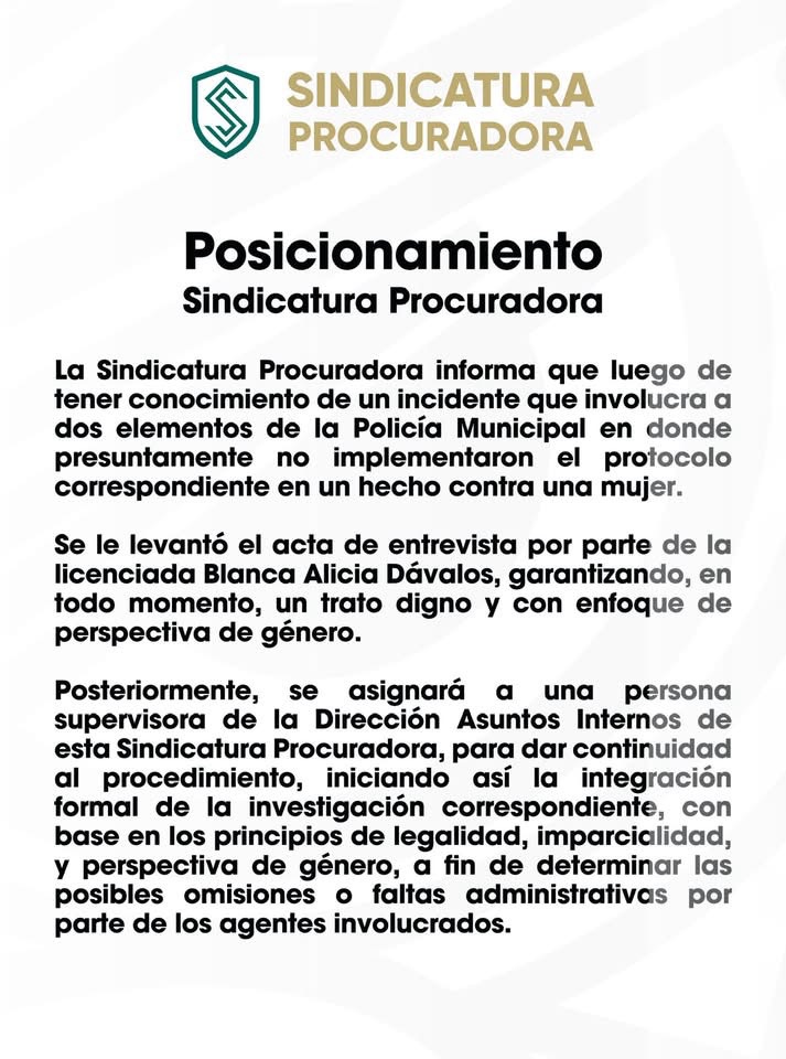 La sĂndica procuradora, Teresita Balderas, asegurĂł que se levantĂł un acta de entrevista con la denunciante bajo acompañamiento jurĂdico y con perspectiva de gĂ©nero. Además, la DirecciĂłn de Asuntos Internos fue instruida para integrar la investigaciĂłn administrativa que determinará si existieron omisiones o faltas en el proceder de los agentes municipales.
