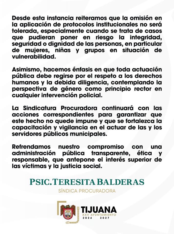 Tras conocerse la denuncia, la Sindicatura Procuradora del Ayuntamiento de Tijuana informĂł que al menos dos elementos de la corporaciĂłn habrĂan incumplido protocolos en la atenciĂłn inicial del caso.