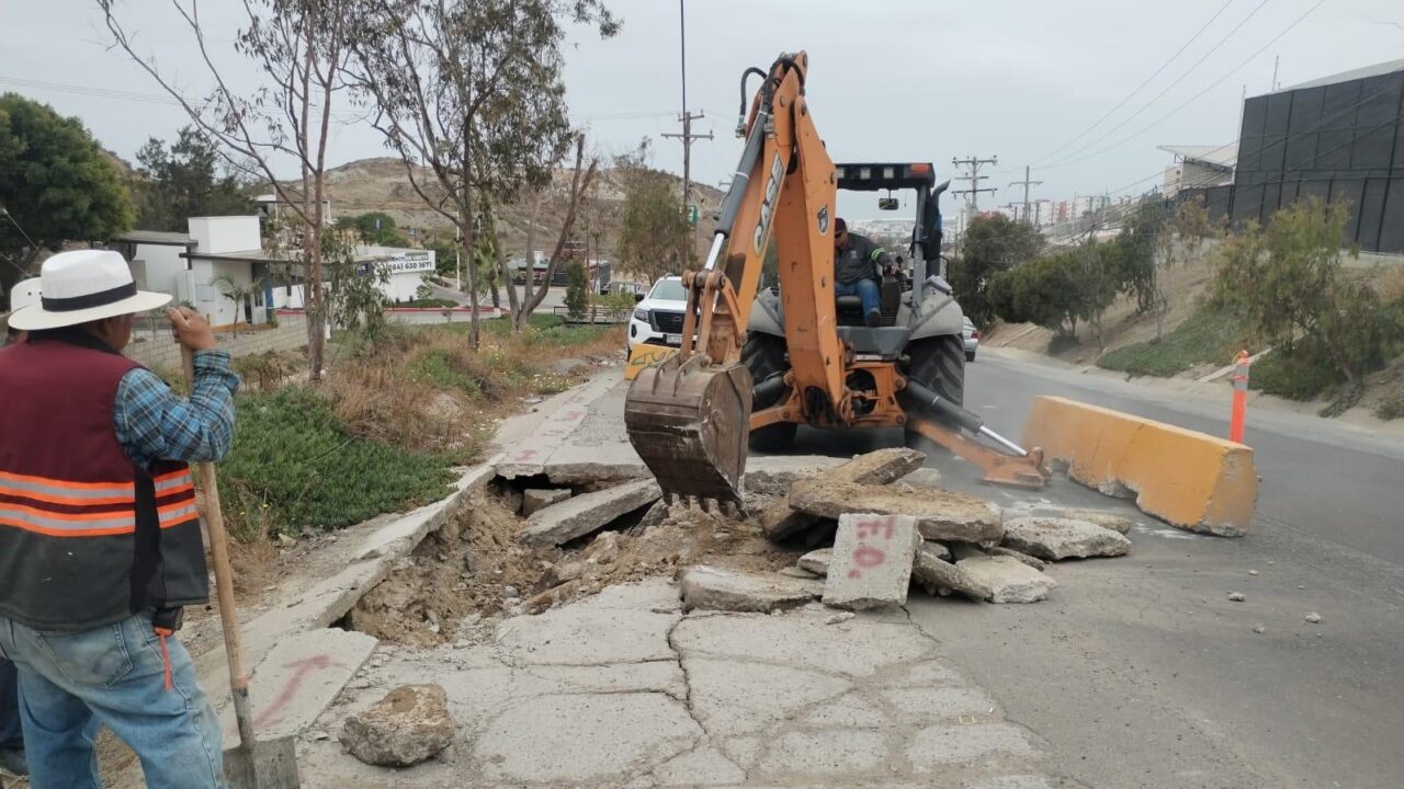 Tijuana, B.C.,, 24 de junio de 2025.- Personal de Obras Públicas trabaja en la reparación de un socavón detectado en la calle Del Agua del fraccionamiento Playa Diamante, ubicado en la Delegación Playas de Tijuana. Las labores, iniciadas el 23 de junio, implican cierres parciales para vehículos y se prevé que continúen durante las próximas semanas.
