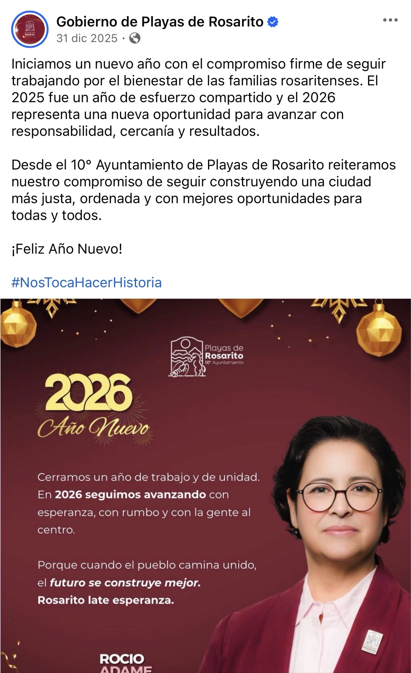 Playas de Rosarito, Baja California | 1 de enero de 2026.- El inicio de 2026 estuvo marcado por una reacción ciudadana intensa en redes sociales tras la publicación del mensaje institucional de Año Nuevo emitido por el gobierno municipal de Playas de Rosarito, encabezado por la alcaldesa Rocío Adame. Lo que comenzó como un posicionamiento oficial de cierre de año y proyección institucional derivó rápidamente en una amplia discusión pública dominada por críticas, reclamos y expresiones de inconformidad.