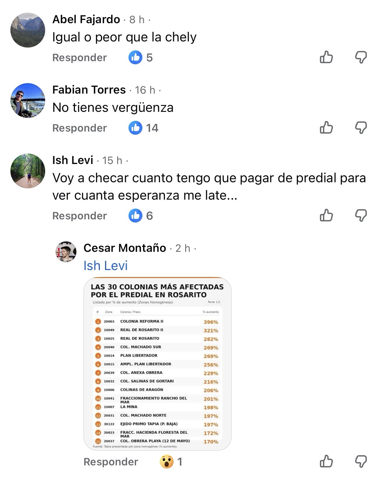 Diversos comentarios hicieron referencia a presuntos aumentos superiores al 150% en zonas habitacionales específicas, acompañados de llamados abiertos a la no participación en el pago del predial, expresiones que, aunque emitidas desde redes sociales, reflejan un nivel elevado de descontento fiscal. En paralelo, otros usuarios compartieron gráficos y listados no oficiales que circulan en plataformas digitales, atribuyendo alzas diferenciadas por colonia.