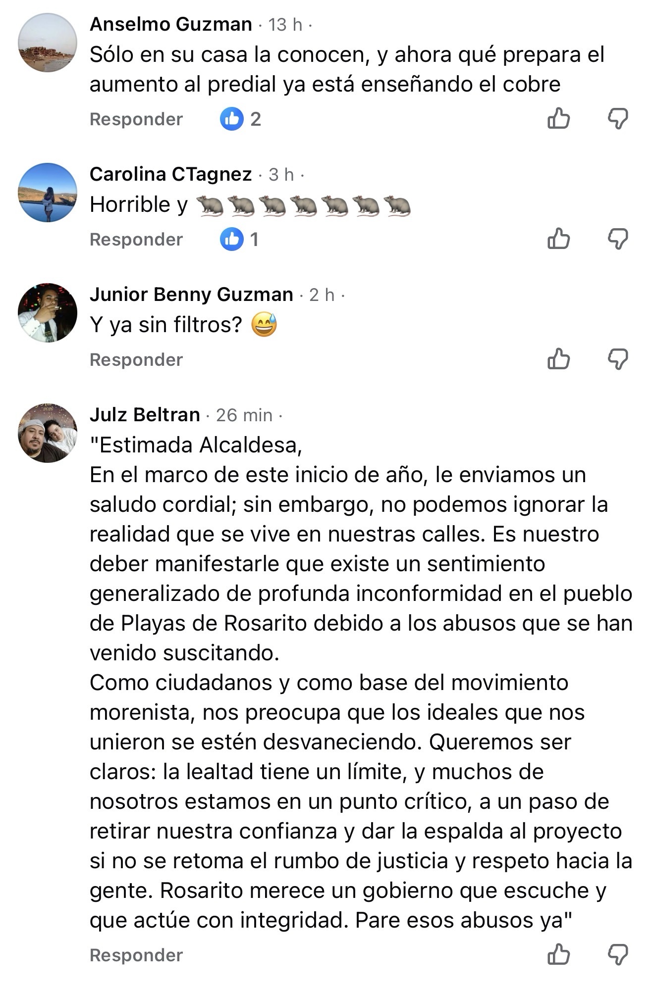 Hasta el momento, el gobierno municipal no ha emitido una respuesta pública específica a los señalamientos concentrados en la publicación de Año Nuevo, ni ha detallado de forma ampliada los criterios técnicos detrás de los ajustes fiscales señalados por los ciudadanos.