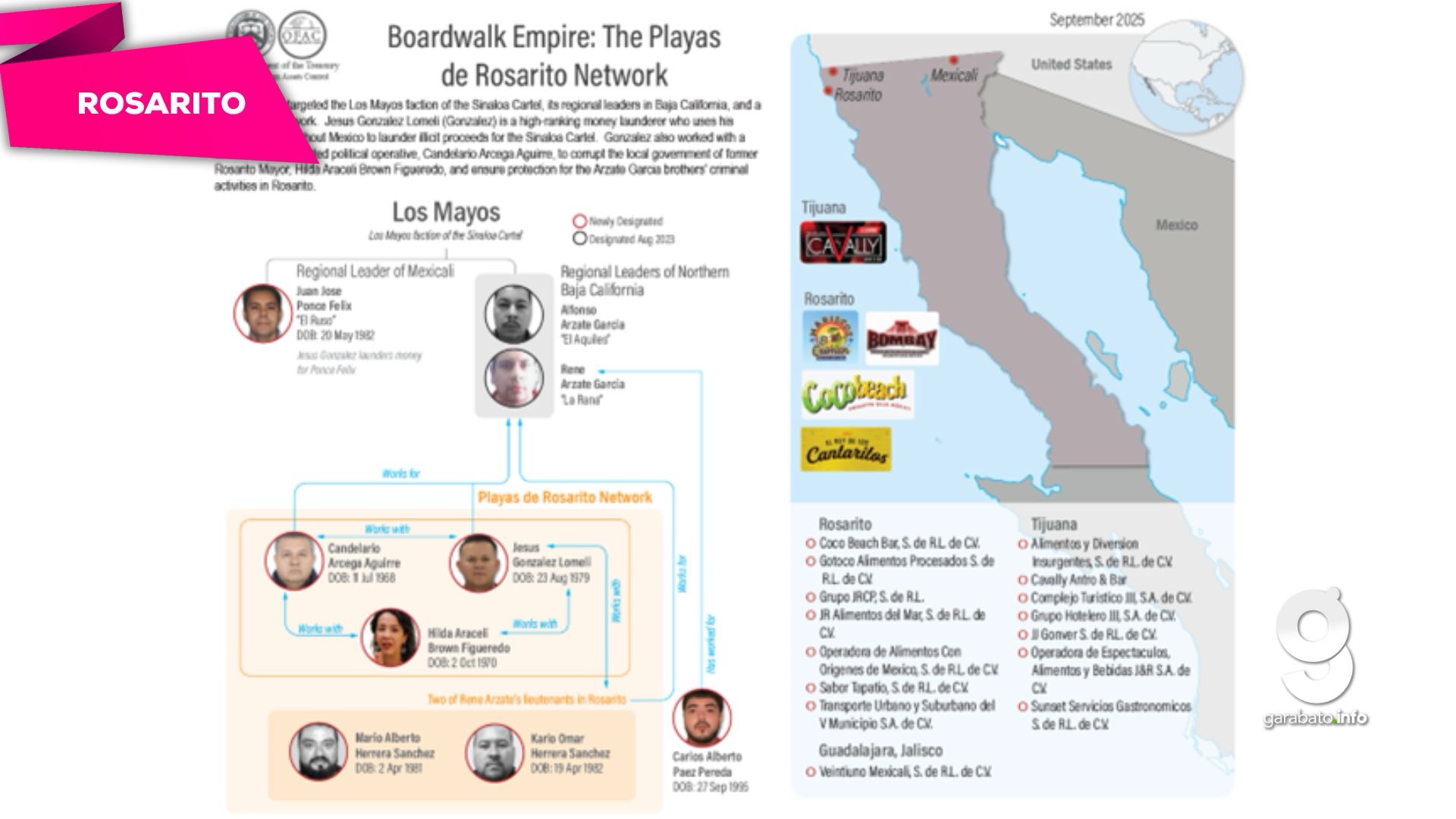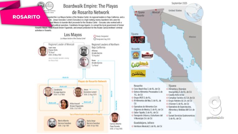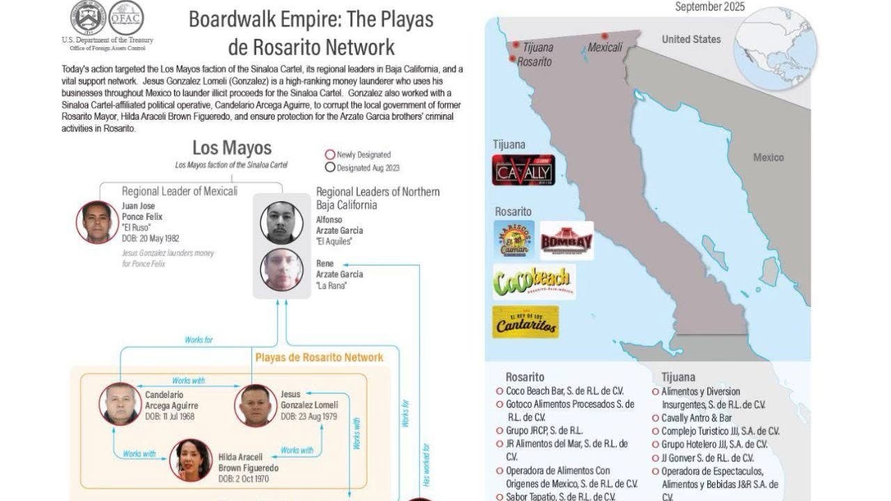 Rosarito, Baja California, 18 de septiembre de 2025. — El Departamento del Tesoro de Estados Unidos, a través de la Oficina de Control de Activos Extranjeros (OFAC), anunció sanciones contra la facción de Los Mayos del Cártel de Sinaloa y a una red de apoyo instalada en Baja California. Entre los señalados figuran Juan José Ponce Félix, alias El Ruso, identificado como lÃder armado en Mexicali; los hermanos Alfonso y René Arzate GarcÃa, considerados operadores en Tijuana; asà como la diputada federal y exalcaldesa de Rosarito, Hilda Araceli Brown Figueredo.