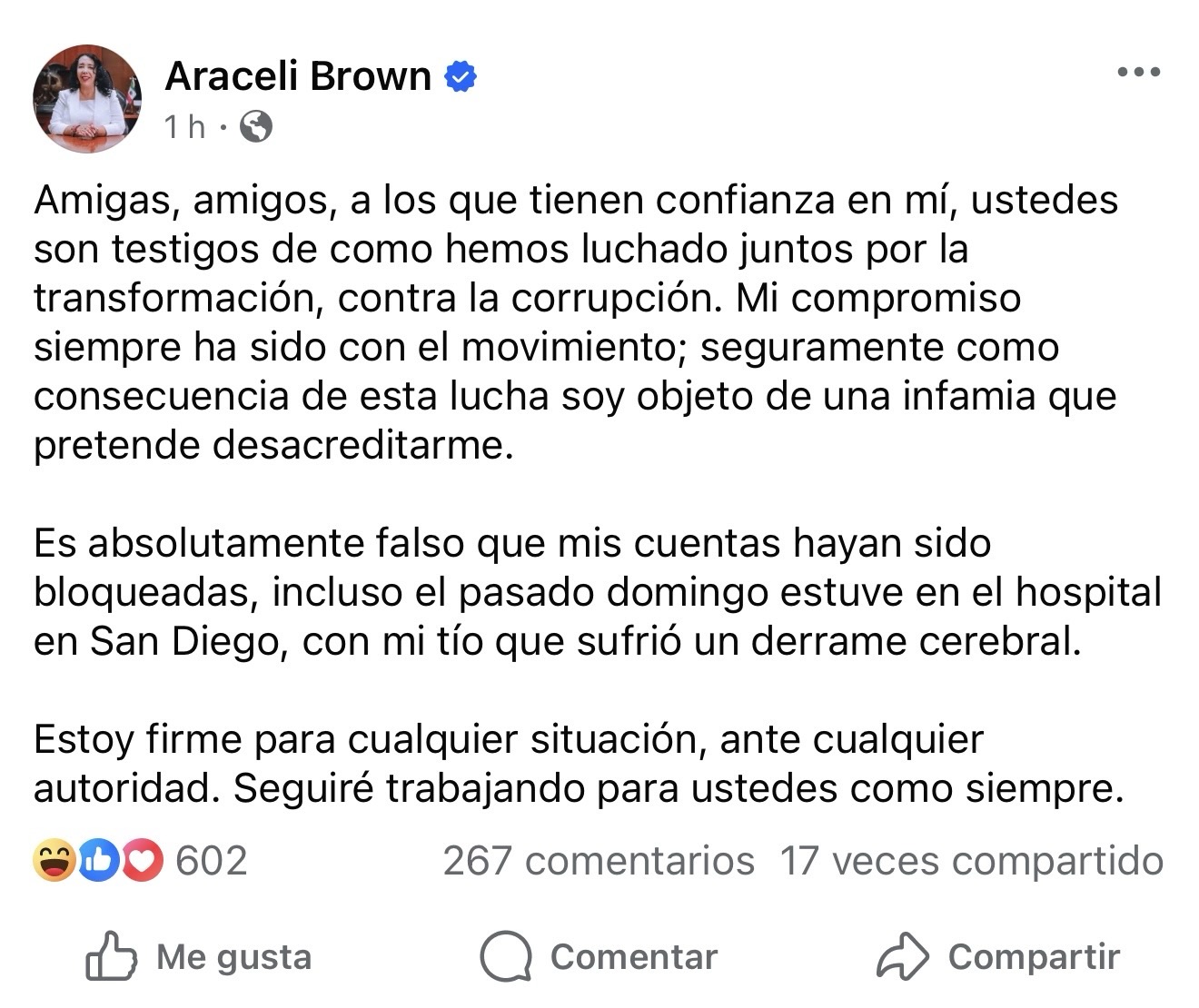 Mientras tanto, la exalcaldesa Hilda Araceli Brown negó públicamente las acusaciones. A través de un mensaje en redes sociales aseguró que sus cuentas no han sido bloqueadas y calificó las versiones como un intento de desprestigio. Añadió que se mantiene firme y dispuesta a atender cualquier requerimiento de las autoridades.