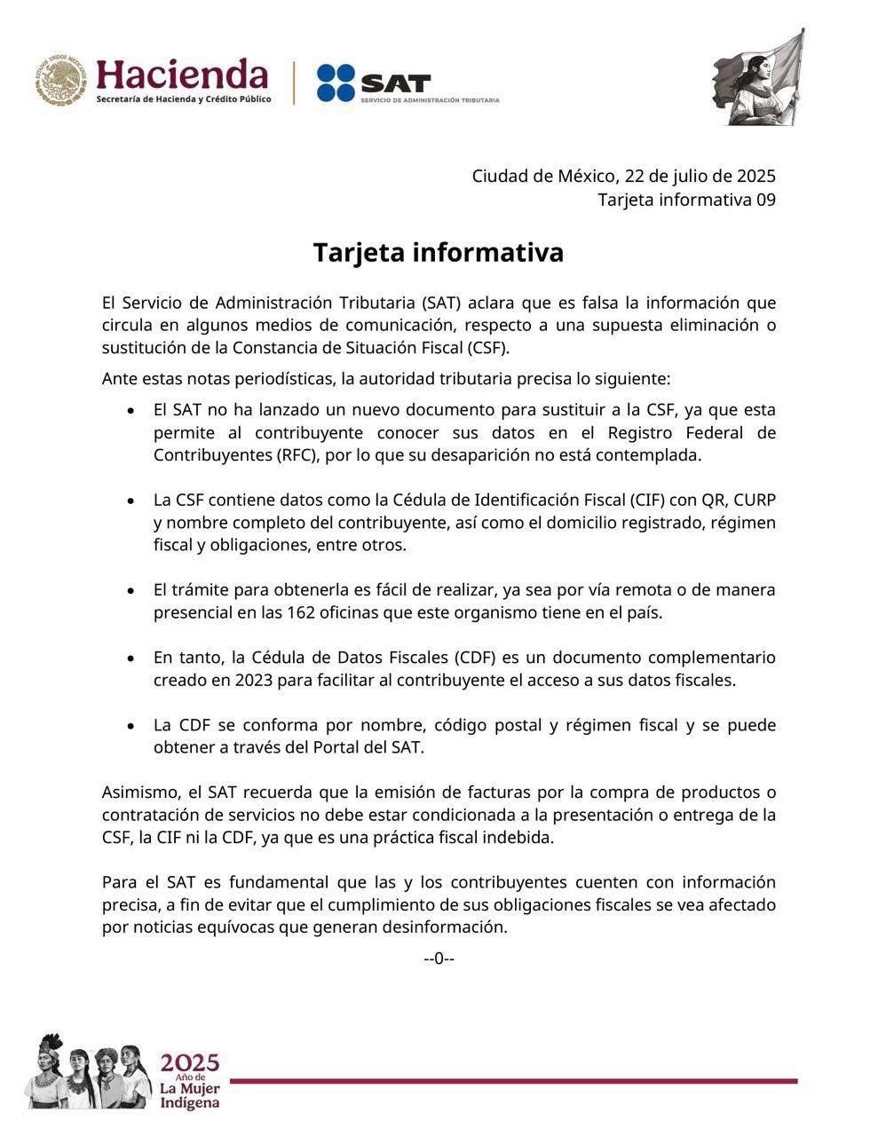 Ciudad de México, 23 de julio de 2025.- El Servicio de Administración Tributaria (SAT) desmintió la información que circula en redes sociales y algunos medios sobre la supuesta eliminación de la Constancia de Situación Fiscal (CSF), documento que sigue vigente y no será sustituido.