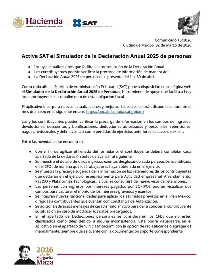 Ciudad de México, 2 de marzo de 2026.- El Servicio de Administración Tributaria (SAT) puso en marcha el simulador de la Declaración Anual 2025 para personas físicas, una herramienta digital que permitirá a los contribuyentes revisar y validar la información precargada antes de presentar formalmente su obligación fiscal en abril.