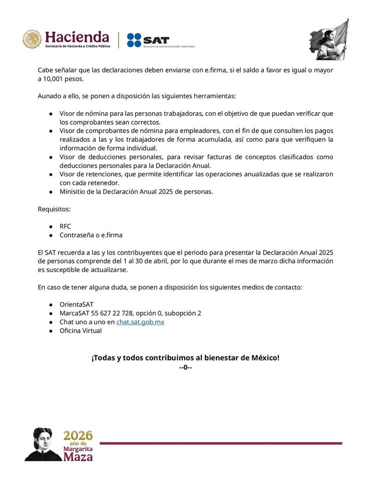 El SAT informó que la Declaración Anual 2025 de personas físicas deberá presentarse del 1 al 30 de abril. Para enviar el trámite será necesario contar con RFC y contraseña; la firma electrónica (e.firma) será obligatoria cuando el saldo a favor sea igual o superior a 10,001 pesos.