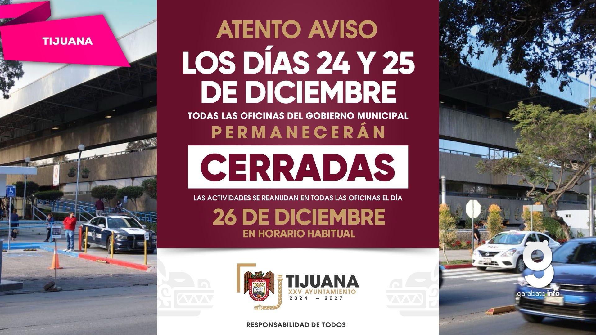 Tijuana, Baja California, 23 de diciembre de 2025. El XXV Ayuntamiento de Tijuana informó que los días miércoles 24 y jueves 25 de diciembre serán inhábiles para el personal del Gobierno Municipal, por lo que las oficinas del Palacio Municipal, delegaciones y dependencias paramunicipales suspenderán la atención al público durante esas fechas.