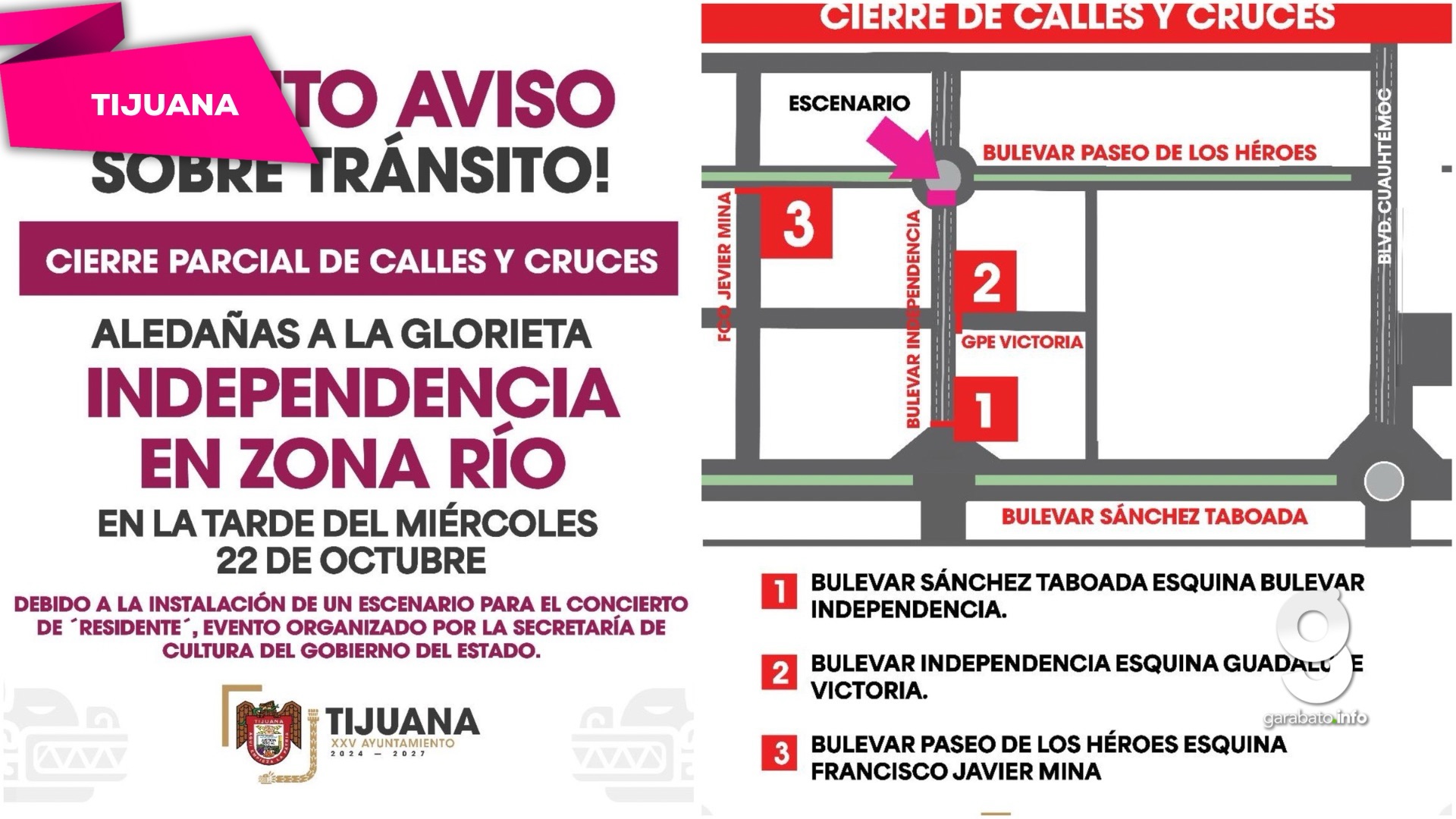 Tijuana, Baja California, a 22 de octubre de 2025. El Gobierno Municipal informó sobre el cierre parcial de vialidades en la zona de la Glorieta Independencia debido a la instalación de un escenario para el concierto del artista urbano Residente, programado para la noche del viernes 24 de octubre. El evento es organizado por la Secretaría de Cultura del Gobierno del Estado y contará con apoyo operativo de la Secretaría de Seguridad y Protección Ciudadana Municipal (SSPCM).