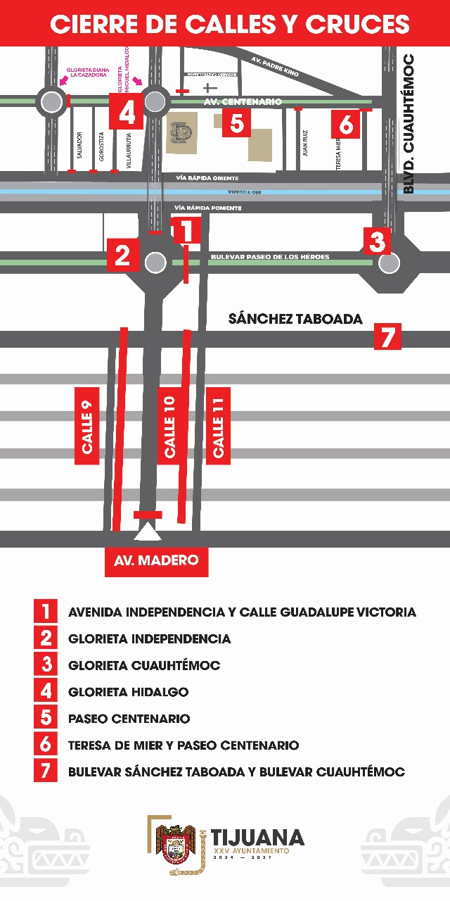 El dispositivo incluye el cierre temporal de puntos estratégicos como Teresa de Mier y Paseo Centenario; los accesos de Media Luna hacia las glorietas Hidalgo e Independencia; los cruces de Paseo de los Héroes con Boulevard Cuauhtémoc, Guadalupe Victoria y Avenida Independencia; ademÔs de diversas intersecciones con SÔnchez Taboada, Ocampo, Madero, Negrete y Quintana Roo. También permanecerÔn sin circulación varios callejones de la zona centro.