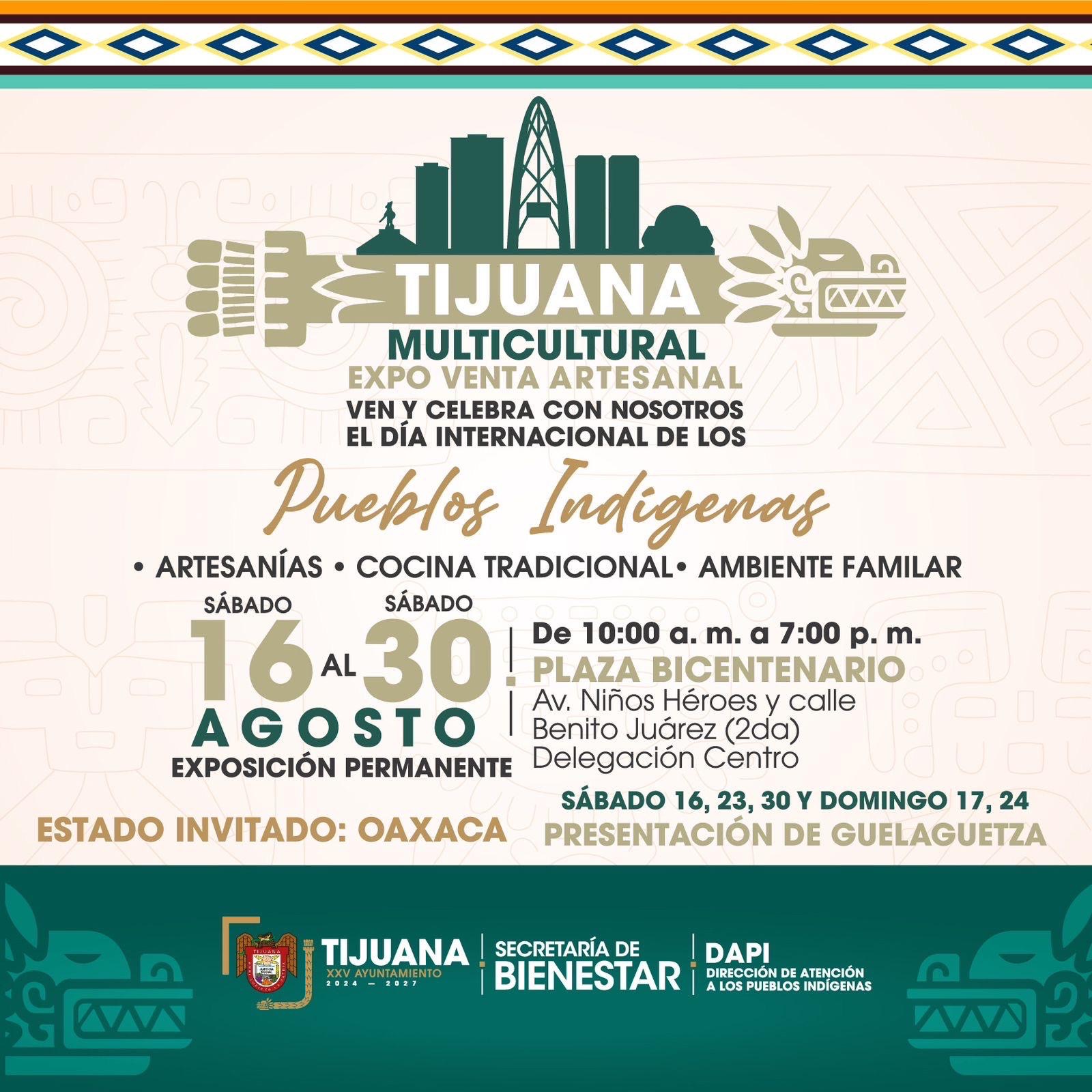 Tijuana, Baja California, 14 de agosto de 2025. La Plaza Bicentenario, en el corazón de la Zona Centro, se transformará en un escaparate de cultura y tradición con la llegada de “Tijuana Multicultural, Expo-Venta Artesanal – Estado Invitado: Oaxaca”, que se realizará del sábado 16 al domingo 30 de agosto.