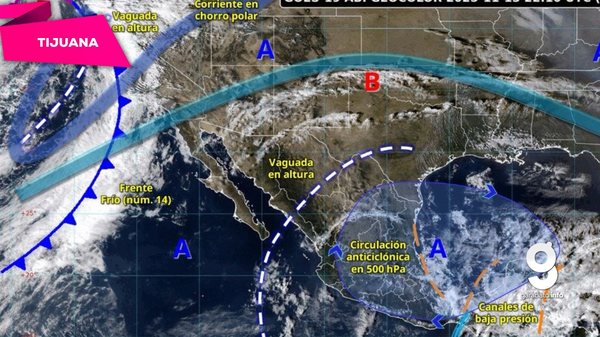 En territorio mexicano, el Servicio Meteorológico Nacional informó que una vaguada en altura y el ingreso de humedad de corrientes en chorro polar y subtropical favorecerán lluvias aisladas en Baja California durante la noche del jueves y madrugada del viernes. Para el sábado, el avance del sistema frontal aumentará la posibilidad de precipitaciones más extensas y viento de 20 a 35 km/h con rachas que podrían superar los 50 km/h, especialmente en la costa del Pacífico y zonas altas.