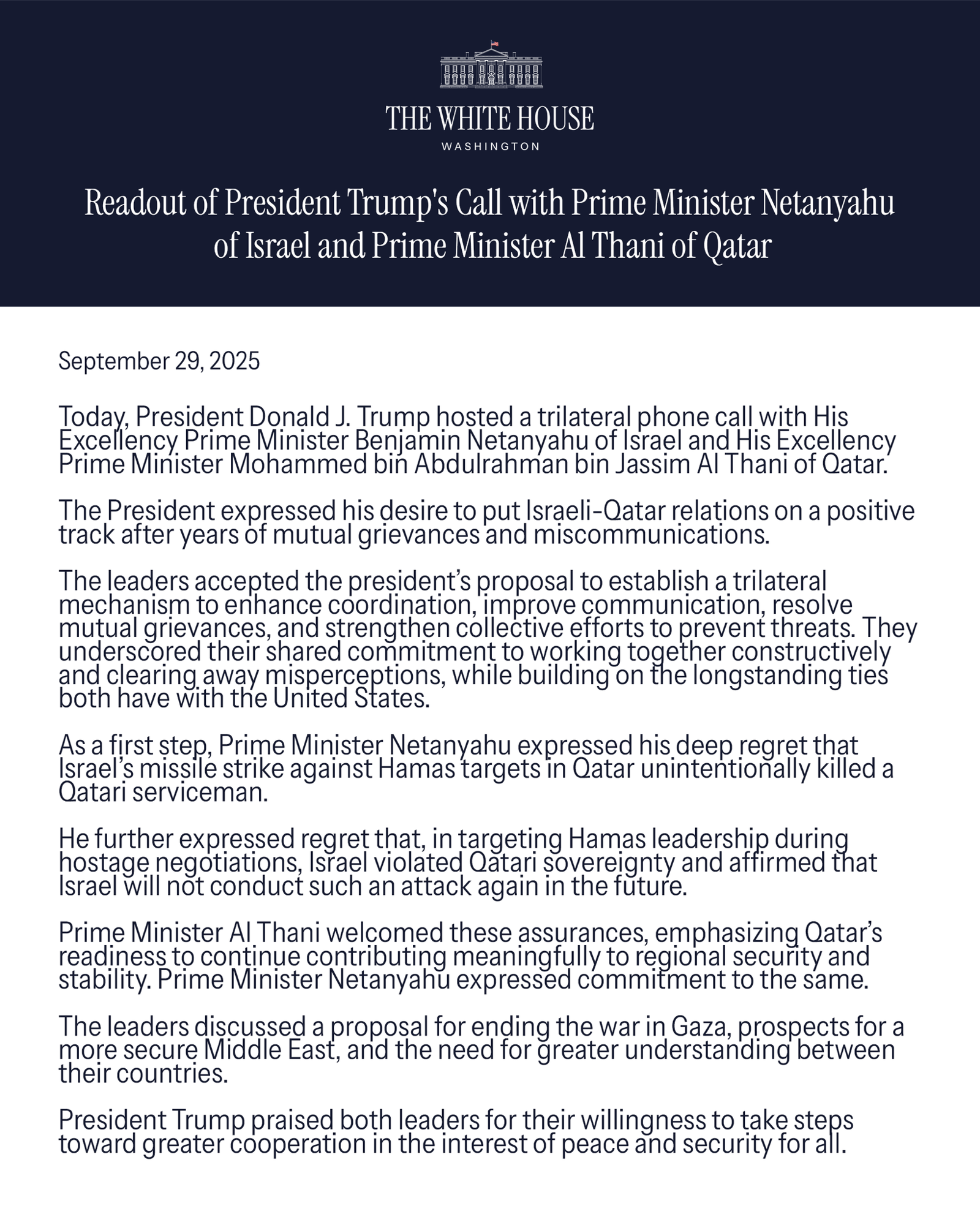 Washington, 29 de septiembre de 2025. El presidente de Estados Unidos, Donald J. Trump, sostuvo una llamada trilateral con el primer ministro de Israel, Benjamin Netanyahu, y el primer ministro de Catar, Mohammed bin Abdulrahman Al Thani, con el objetivo de recomponer las relaciones entre ambos países tras años de tensiones y desconfianza.