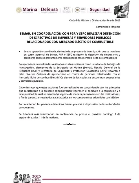 El titular de la SSPC, Omar GarcÃa Harfuch, confirmó la detención e informó que forma parte de una ofensiva más amplia contra el huachicol fiscal y las redes de corrupción en instituciones federales.